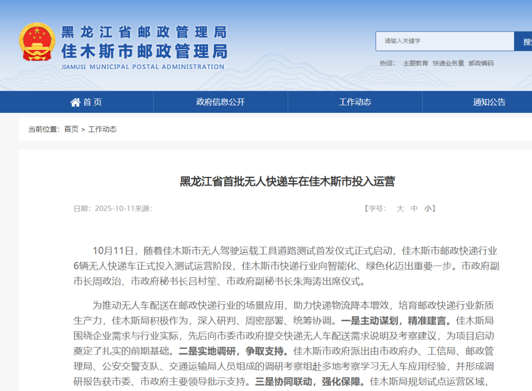 此次佳木斯市共投入6辆无人快递车,车辆投入使用后,预计配送效率较传统方式提高20%-40%,结合各家企业业务量实际,单辆车日均配送量约500-2500件左右,单票配送成本预计实现15%-30%的降幅,在有效缓解“招工难”问题的同时,也缓解了快递末端网点经营压力。另外,无人快递车为纯电动驱动实现零排放,完全契合绿色物流发展趋势。