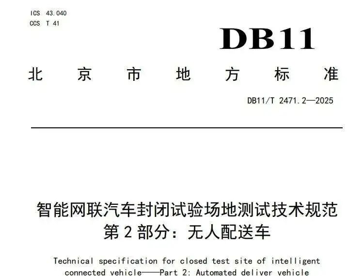 近日,北京市市场监督管理局发布了4项自动驾驶领域地方标准,涉及智能网联汽车封闭试验场地测试、车路云一体化路侧基础设施两大核心领域,包括《智能网联汽车封闭试验场地测试技术规范 第1部分:乘用车》《智能网联汽车封闭试验场地测试技术规范 第2部分:无人配送车》《车路云一体化路侧基础设施 第6部分:信息安全技术要求》《车路云一体化路侧基础设施 第7部分:运维管理系统应用技术要求》。前两项细分标准精准聚焦乘用车和无人配送车这两种不同应用场景车型。