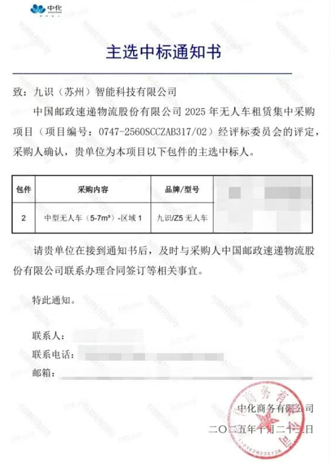 在中国邮政上月启动的7000台无人车集中采购项目中,九识智能凭借其领先的自动驾驶技术和成熟的商业化运营能力,中标入围全部标段,且全车系均成为主选中标人,成为了中国邮政智能化升级的核心供应商!