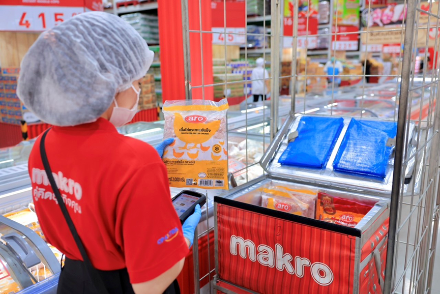 在曼谷一家万客隆超市里,工作人员在数字系统指引下拣货,效率提升140%