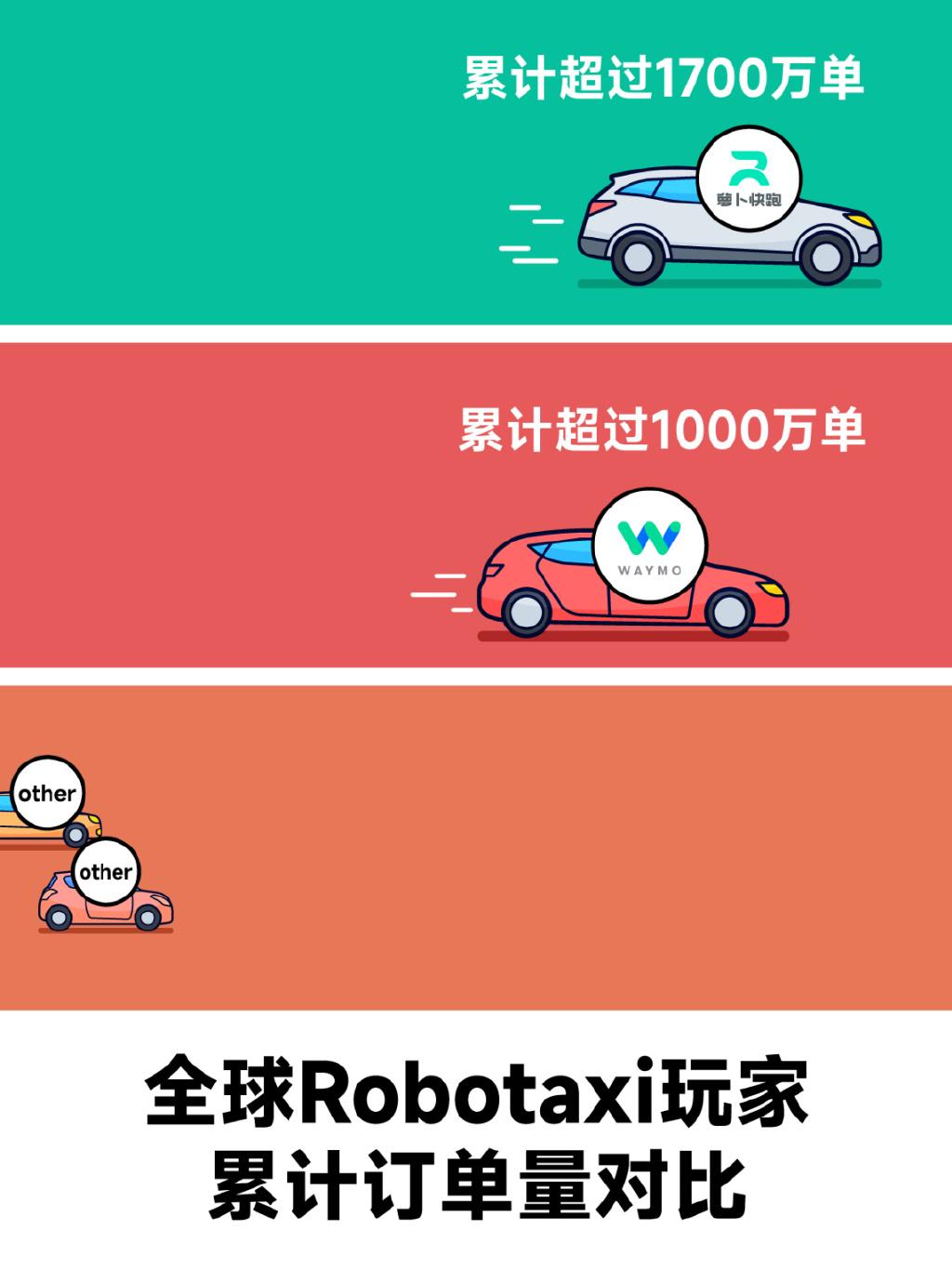 从累计订单量来看,萝卜快跑目前累计超过1700万单,高于Waymo的1000万单。