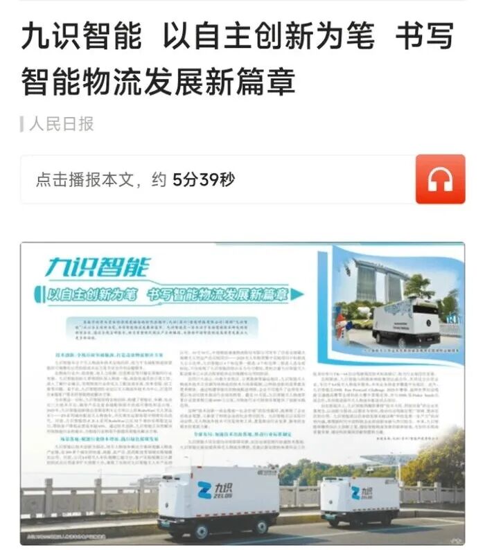 人民日报:九识智能以自主创新为笔 书写智能物流发展新篇章 12月4日,《人民日报》发布彩色特刊《九识智能 以自主创新为笔 书写智能物流发展新篇章》,阐述了九识(苏州)智能科技有限公司(简称“九识智能”)作为专注于自动驾驶技术研发的创新型企业,如何通过全栈自研技术,助力重塑现代物流产业新格局,为推动中国智能制造高质量发展注入更多新动能。