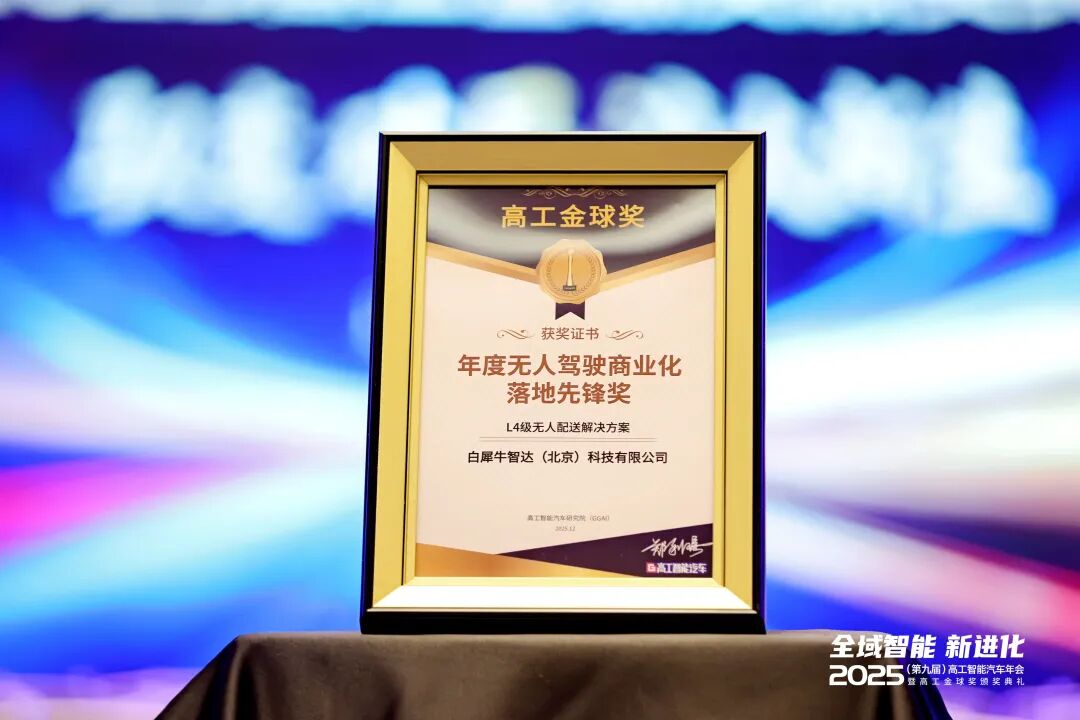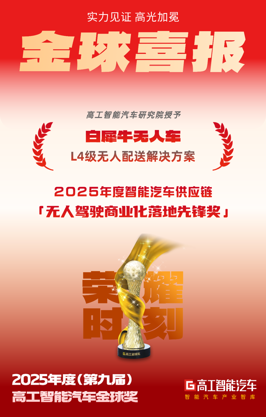 近日,第九届2025高工智能汽车金球奖揭晓!被誉为智能汽车行业 “奥斯卡” 的该奖项,自2017年创办以来聚焦技术产品创新、前装定点、量产规模及全球化布局四大维度,是行业发展重要风向标。作为L4级无人配送标杆企业,白犀牛凭借无人驾驶技术突破与末端配送规模化商业化成果,斩获 “年度无人驾驶商业化落地先锋奖”,硬核实力获行业权威认证。
