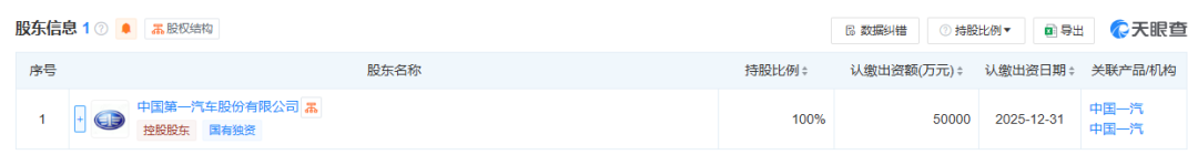 股权穿透图显示,该公司由中国第一汽车集团有限公司(以下简称“中国一汽”)旗下的中国第一汽车股份有限公司全资持股。