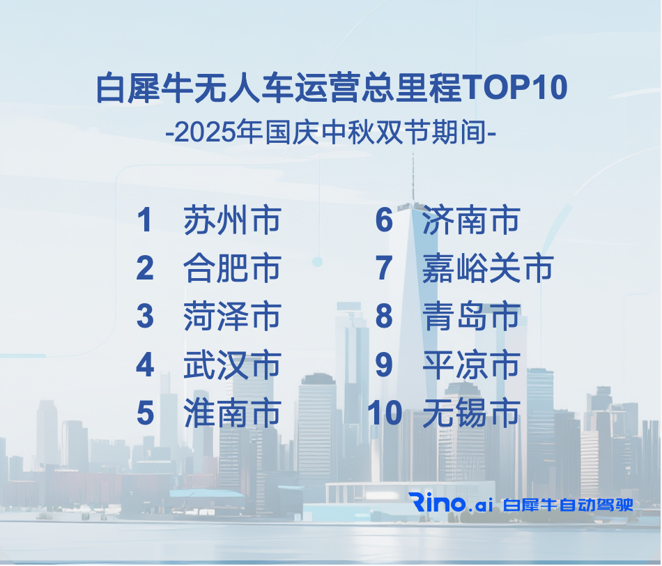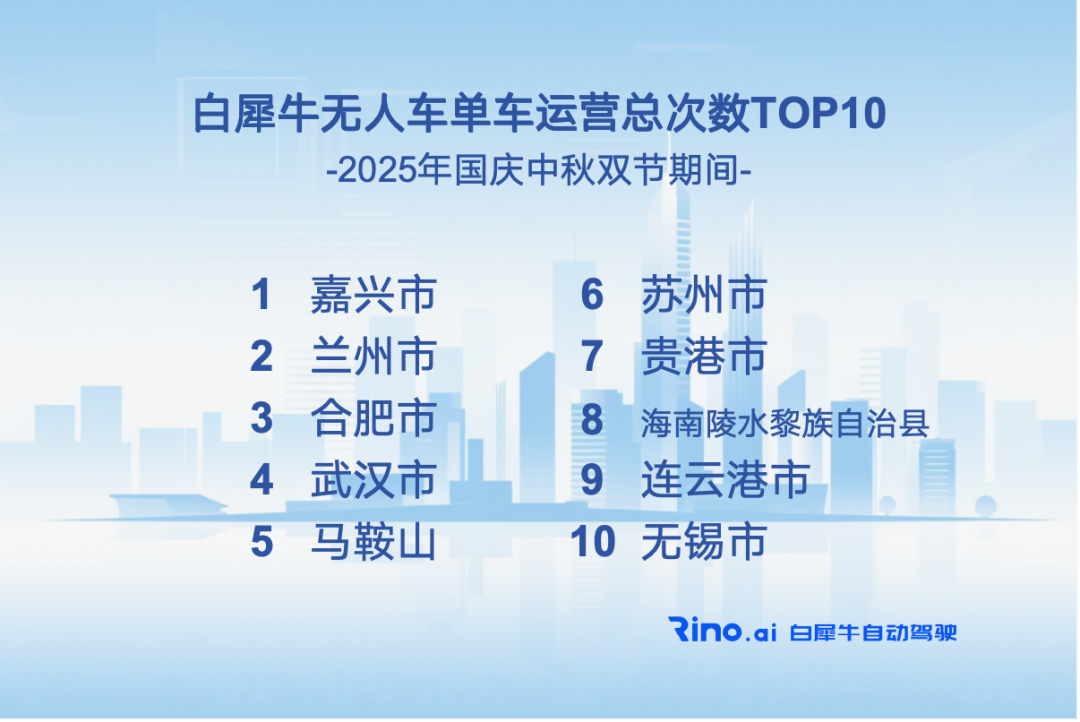 白犀牛无人车总运营里程TOP10的城市是双节期间无人配送运营的核心发力区域。既涵盖了东部电商物流活跃的城市,也包含了中部作为区域物流枢纽的城市,更延伸至西部民生保障与基建需求突出的城市。打破了传统物流在假期易出现的“东部拥堵、中西部运力不足”的区域壁垒,真正构建起覆盖全国的无人物流服务网络,为各地居民提供了及时、高效的配送服务。 在单车运营效率上,白犀牛无人车展现出强劲的作业能力,单车运营最高发车次数达99次,充分保障了物流配送的时效性。 单车运营总次数TOP10的城市显示出白犀牛无人车的单车效率并非局限于个别核心城市,而是能在全国不同需求场景下稳定输出。“广覆盖+高效率”,白犀牛无人车全面服务有效填补了假期运力缺口,为物流的顺畅运转提供有力支撑。 为全力保障双节假期物流“全天候不中断”,白犀牛无人车全程实行24小时不间断配送模式。其中,10:00-11:00成为全天配送最活跃的时间段,此时段内订单集中、运力调度高效,无人车精准匹配假期物流需求高峰,助力节日物资等快递快速送达。 从白天到深夜始终保持运力在线,用持续服务打通物流配送的“时间壁垒”。 其中,夜间时段(22:00-次日6:00)作为传统物流运力易短缺的关键窗口,白犀牛无人车仍稳定输出服务,累计发车次数近1000趟,有效填补了夜间人力配送的空白,确保应急物资、夜间下单的民生物资等都能及时送达,避免因时段限制导致的配送延误。 北京某顺丰速运中转场成为双节期间的“最繁忙的物流枢纽”。该网点累计完成配送795趟,高频次的往返运输为首都区域物流周转提供强力支撑 在同时段运营规模上,最多有150台无人车在47个城市同步开展配送作业。打破地域限制,大幅提升了全国范围内的物流服务覆盖度,让无人配送惠及更多地区。