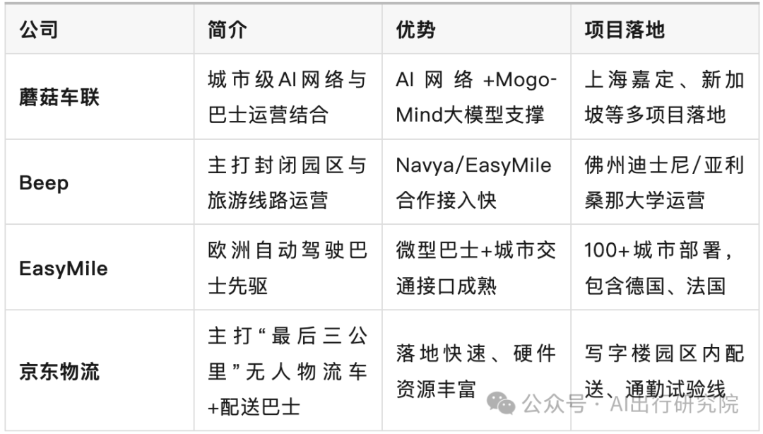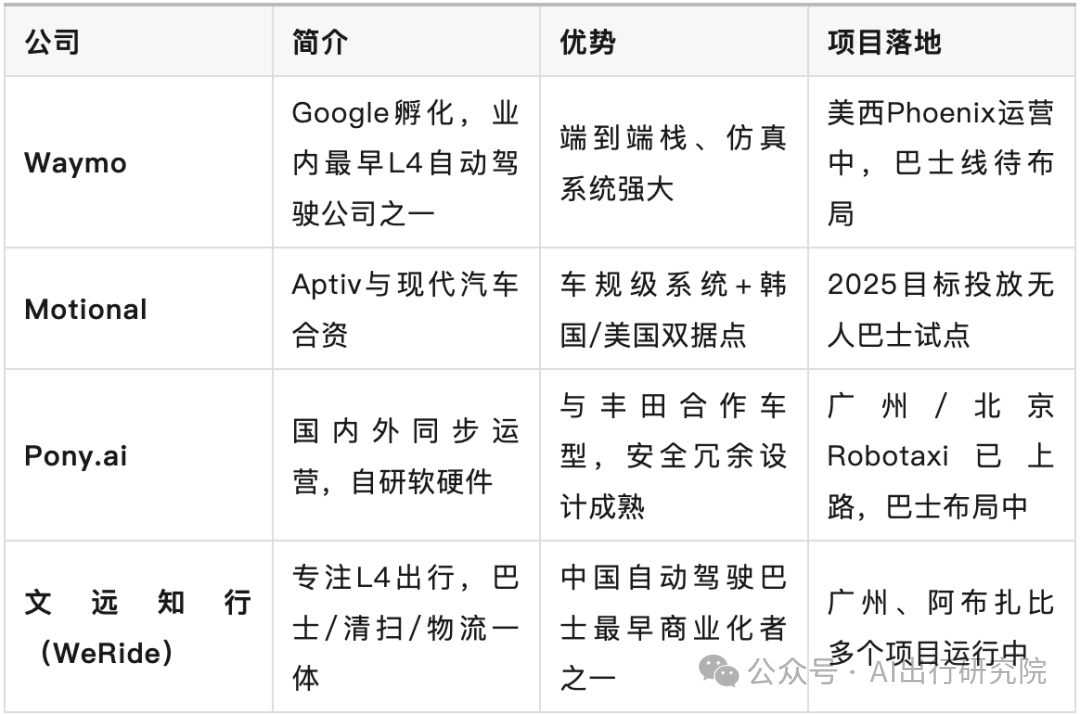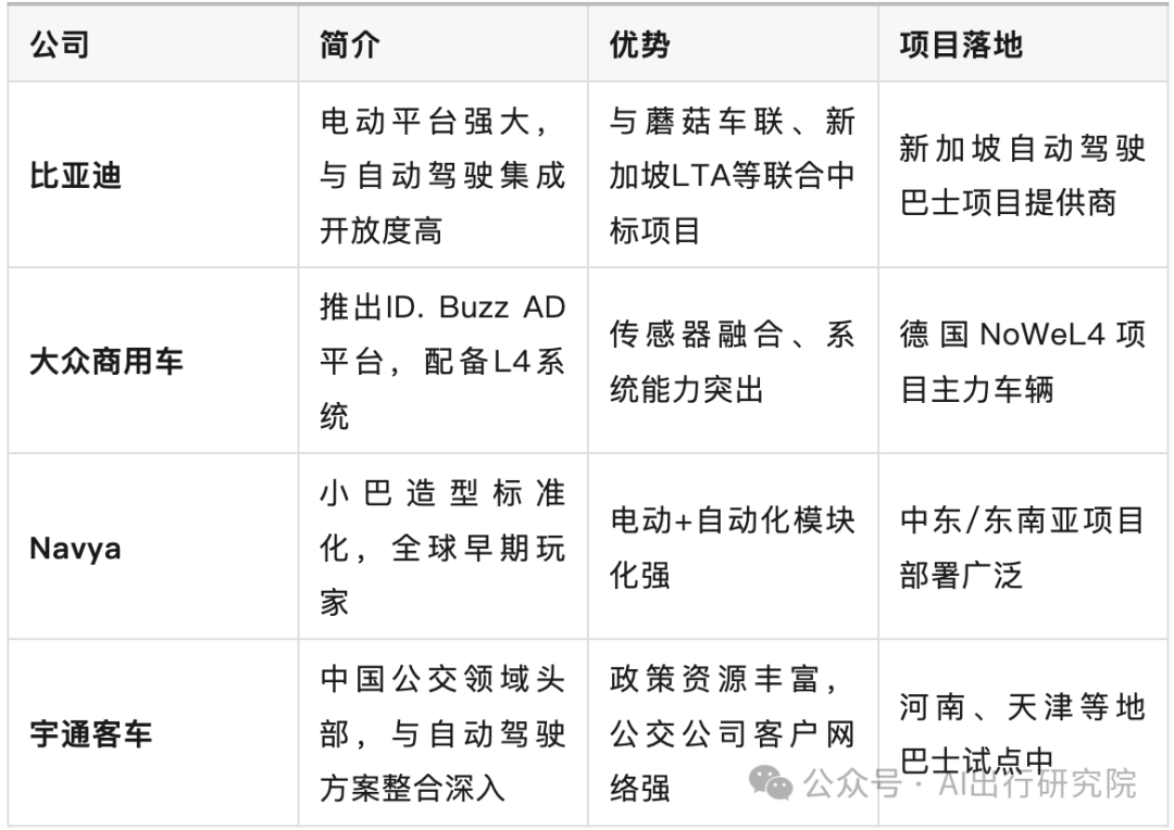 在讨论自动驾驶时,我们习惯聚焦Waymo、Cruise、Apollo这类“技术明星”,它们用炫目的传感器堆叠、端到端模型与复杂交通场景博弈,定义了“Robotaxi”的科技门槛。 但如果我们把目光从“私家车替代”转向“公共出行革命”——自动驾驶巴士的格局则完全不同。 它不只是一辆车跑起来的问题,而是一个完整系统能否稳定服务上万人、适配城市运行逻辑、和财政政策并轨的问题。它要求的不只是算法精度,而是“系统工程”的全面落地能力。 而当我们梳理全球正在推进自动驾驶巴士商业化的公司时,会发现——它们已经形成了明确的五大“门派”:技术派、场景派、平台派、制造派、城市派。 这篇文章,尝试给出一个全球自动驾驶巴士的“打法分野”,为产业提供一个更务实的参照体系。 代表公司:Waymo、Motional、Pony.ai、WeRide 这些公司起步于Robotaxi,是最早跑进自动驾驶领域的“算法派”,他们擅长构建感知、定位、预测、控制等闭环系统,拥有强大的技术模型演进能力。在测试中运行的巴士或通勤车项目,更多是其Robotaxi系统的延展——挑战性高、落地速度慢,但具备行业范式意义。 代表公司:蘑菇车联、BeeTech、EasyMile、京东物流(轻舟智航) 这类公司以最后一公里、“园区循环”“校区接驳”等轻型巴士或中速封闭线路为突破点,强调的是“先跑起来、再升级”,真实场景驱动,商业化速度快。 3️⃣ 平台派:构建“车-路-云-图”融合的系统平台 代表公司:蘑菇车联、百度Apollo、宇通智能、文远 以蘑菇车联为例,其提出“城市AI交通智能体”概念,强调自动驾驶不仅是车辆问题,更是交通系统重构工程。它既提供具身智能车辆,也输出大模型调度系统,并能对接交管、公交系统、基础设施等。 Navya、EasyMile等欧洲企业也强调标准化平台能力,服务于多城市部署。 4️⃣ 制造派:硬件整合力最强,具备大规模交付潜力 这类公司背靠传统客车制造能力,拥有稳定产线、成熟供应链和合规资质,是自动驾驶巴士产业真正“能交车”的一派。 宇通自动驾驶巴士已批量投放至郑州、武汉等地;金龙与中科慧拓合作在矿区、景区多地运营;韩国Shuttle已向政府提供多轮试验车。 自动驾驶巴士的竞争,本质不是比“谁更聪明”,而是“谁能活下去”。在2025~2027这个窗口期,真正能跑通商业闭环的公司,必然具备三重能力:
