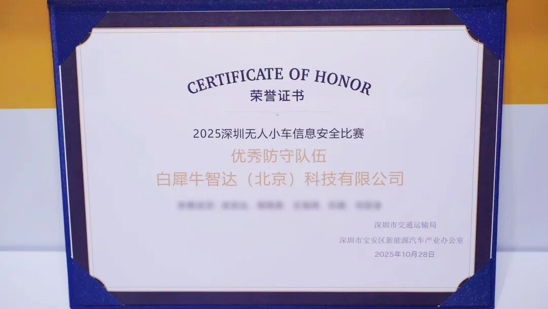 9月28-30日,白犀牛携旗下R5无人车参展2025深圳国际智能网联汽车产业展览会(WAC 2025),以硬核技术实力与清晰布局战略吸引众多参展观众与海外媒体的关注。同期,在深圳无人小车信息安全比赛中,获得“优秀防守队伍奖”,也体现了行业对白犀牛无人车产品安全性与可靠性的认可。