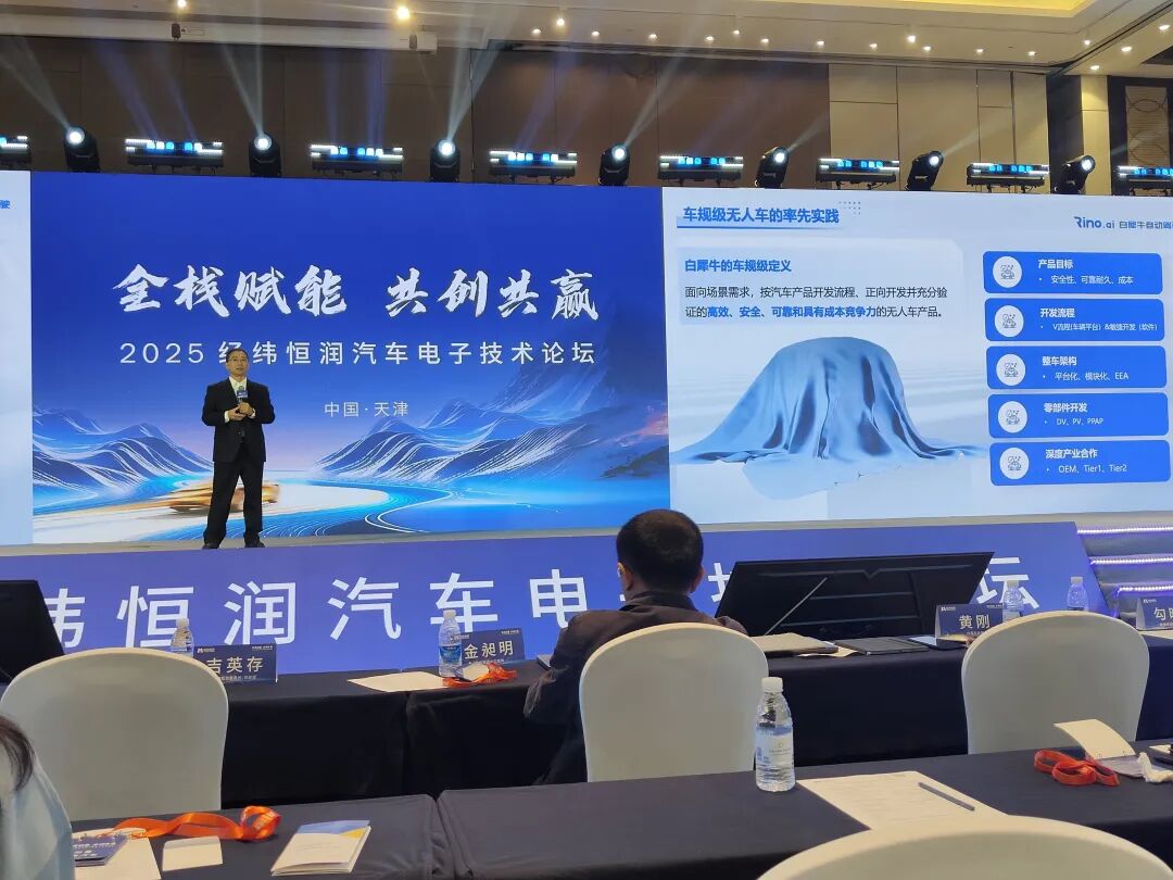 10月24日,在2025经纬恒润全球生态合作伙伴大会上,全球各地汽车供应链厂商围绕企业战略规划、新产品布局、供应链体系建设等重要议题展开深入交流。期间,白犀牛总裁黄刚受邀发表演讲,分享白犀牛在无人驾驶物流车领域的实践与思考,助力行业生态交流与协同发展。