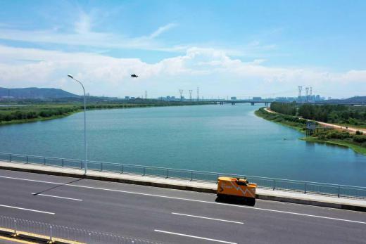 无人机巡视跨越河流的线路,无人车自主驶往线路终点,等候接收无人机。