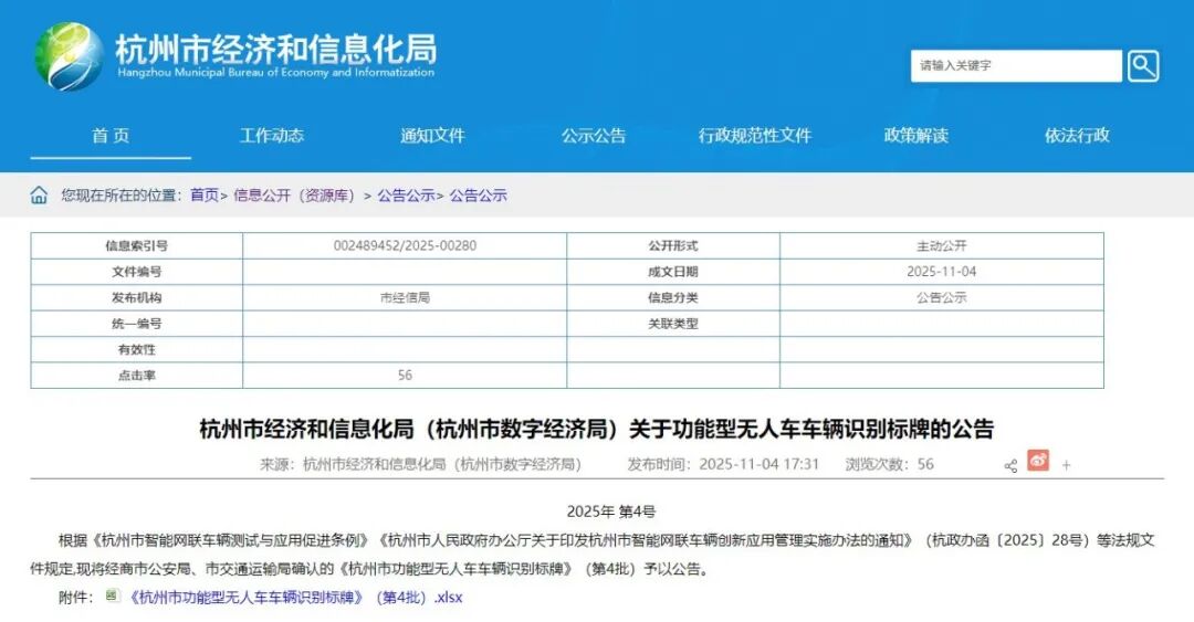11月4日,根据《杭州市智能网联车辆测试与应用促进条例》《杭州市人民政府办公厅关于印发杭州市智能网联车辆创新应用管理实施办法的通知》(杭政办函〔2025〕28号)等法规文件规定,杭州市公布第4批《杭州市功能型无人车车辆识别标牌》。