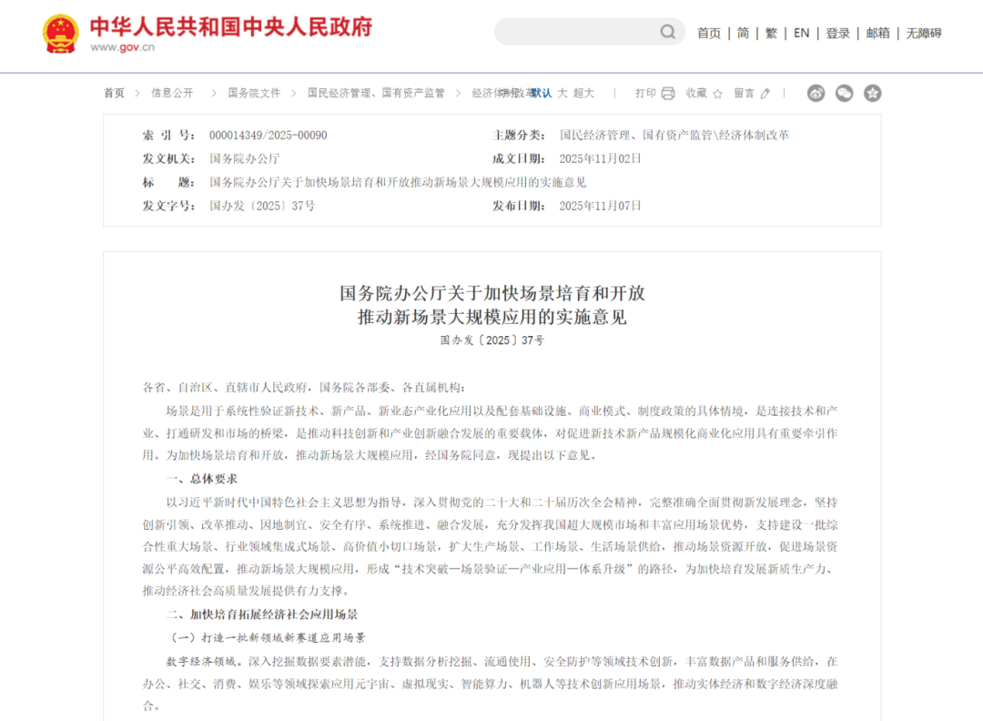 11月7日国务院办公厅印发意见,加快新场景培育开放与大规模应用。以新发展理念为指导,聚焦数字经济、人工智能、全空间无人体系等领域,培育拓展生产、工作、生活等多类场景,推动场景资源开放公平配置,形成 “技术突破 — 场景验证 — 产业应用 — 体系升级” 路径,强化政策与制度保障,为培育新质生产力、推动高质量发展提供支撑。