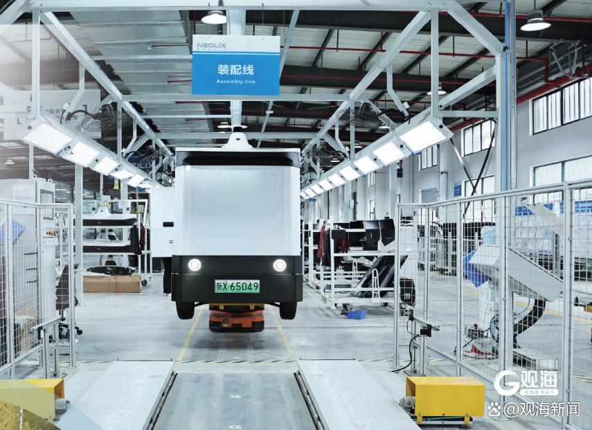 新石器工厂内,一辆无人车在装配线上等待进一步加工。