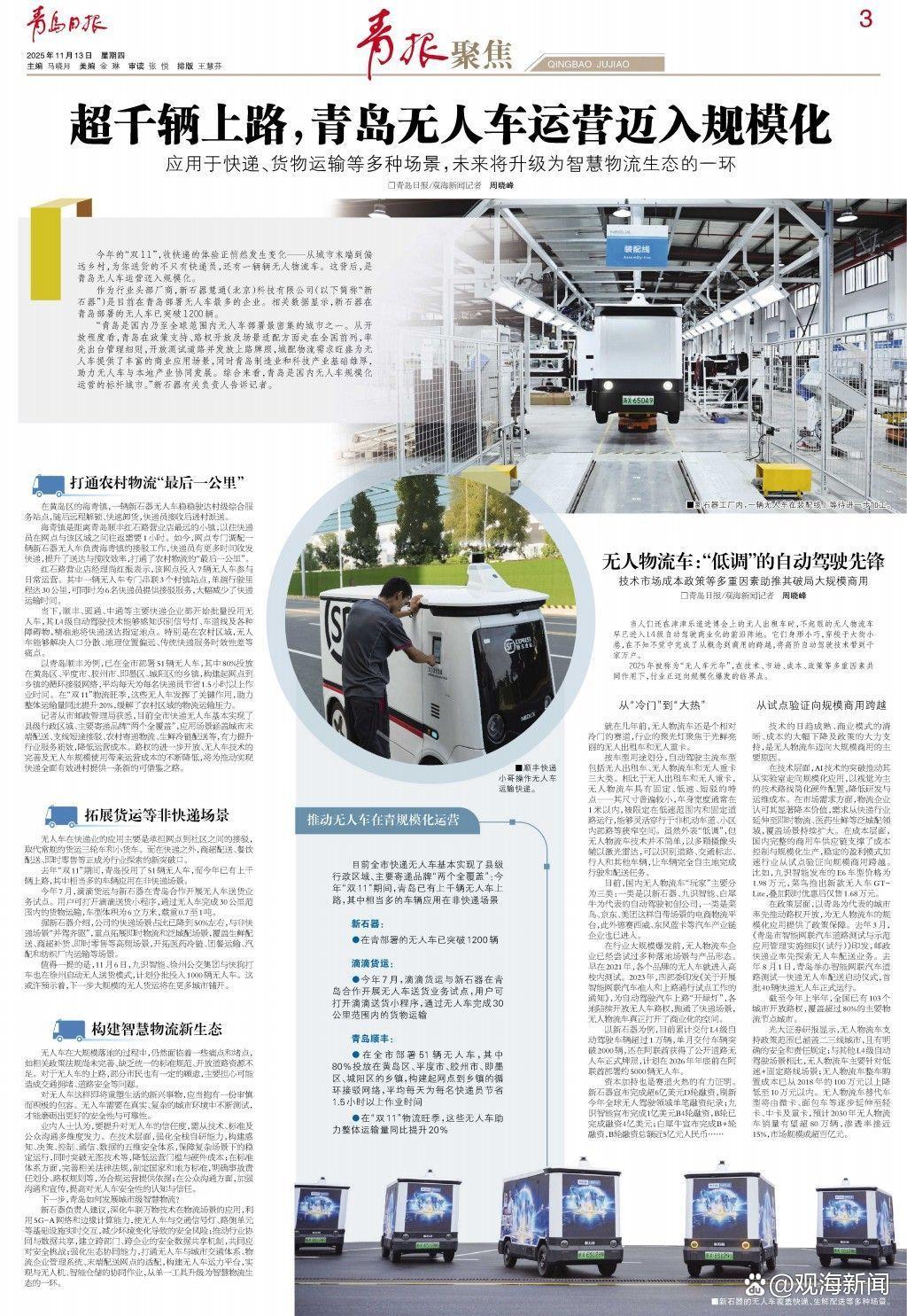 今年的“双11”,收快递的体验正悄然发生变化——从城市末端到偏远乡村,为你送货的不只有快递员,还有一辆辆无人物流车。这背后,是青岛无人车运营迈入规模化。