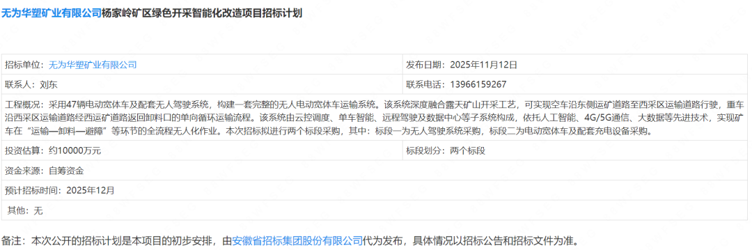 新战略低速无人驾驶全媒体获悉,11月12日,无为华塑矿业有限公司发布杨家岭矿区绿色开采智能化改造项目招标计划,项目总预算为1亿元,预计将于2025年12月正式开始招标。公告显示,拟采用47辆电动宽体车及配套无人驾驶系统,构建一套完整的无人电动宽体车运输系统。
